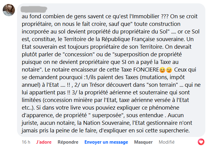 Dès lors, on peut se demander si les individus qui achètent des biens immobiliers sont réellement propriétaires de ces biens. Ne serait-il pas plus exact de parler de concession, c’est-à-dire d’un droit d’usage accordé par l’État moyennant le paiement d’une taxe ?