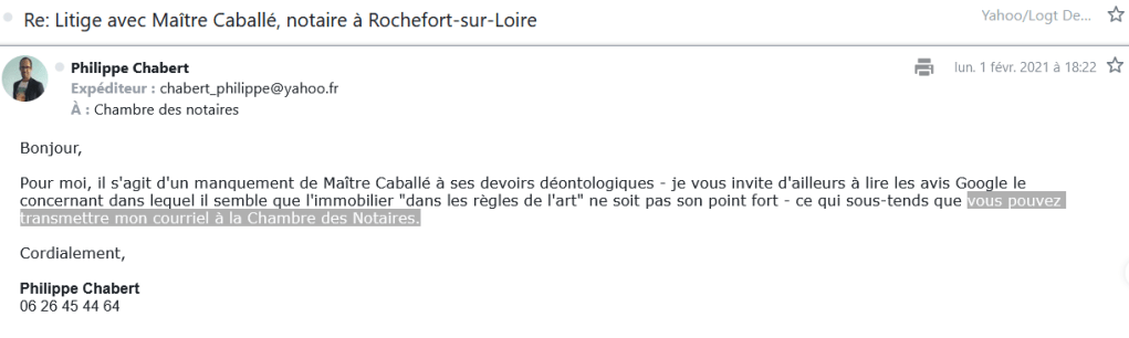 En février 2021, Monsieur CHABERT a déposé une plainte à la Chambre des notaires du Grand Anjou contre Maître CABALLÉ (pièce 12) pour des manquements disciplinaires, puisqu’en tant que notaire négociateur et rédacteur de l’acte de vente il ne répondait à aucune sollicitation de sa part.