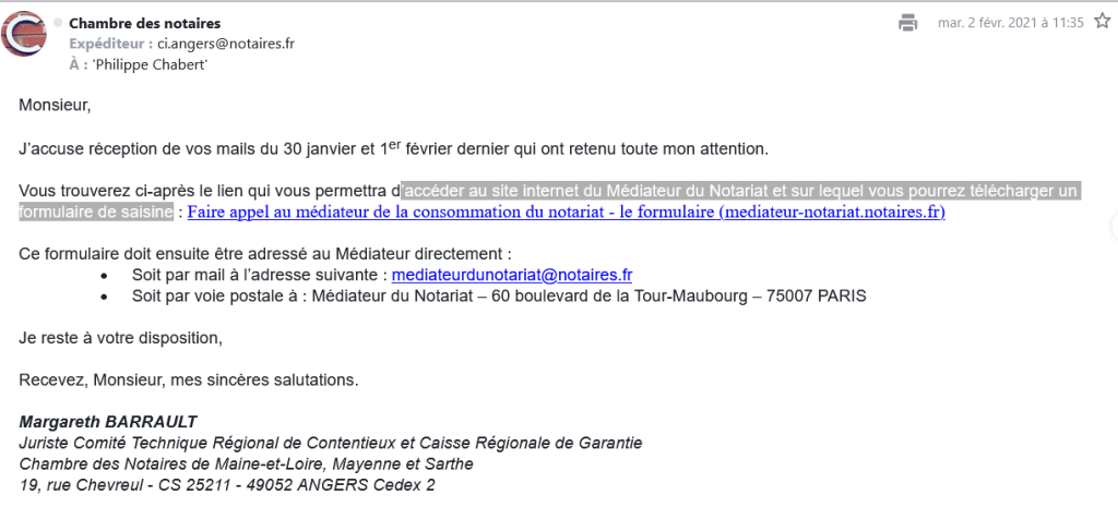 Le médiateur du notariat évoque pourtant lui-même sur le site « Actu-Juridique » que « Le client qui se plaint que le notaire ne lui a pas répondu à des demandes écrites ne correspond pas à une demande de médiation. Dans ce genre de cas, il s’agit d’une réclamation qu’il a tout intérêt à formuler auprès du président de la Chambre des notaires« . Ce que Monsieur CHABERT a pourtant fait!