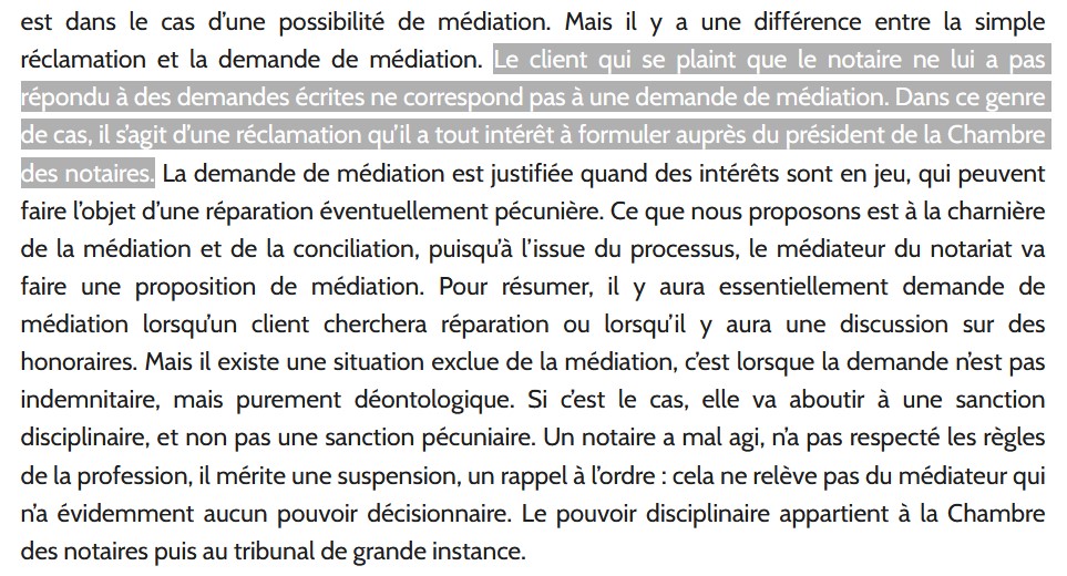 Pour seule réponse, alors que Monsieur CHABERT demandait des sanctions contre Maître CABALLÉ qui ne répondait pas à ses obligations professionnelles, la Chambre à orienté Monsieur CHABERT vers le Médiateur du Notariat, dont le rapport annuel indiquait que « 56% des demandes ne peuvent prospérer du fait du refus du notaire de participer au processus de médiation (28%) ou du défaut de réponse de la part du notaire à la demande réitérée par le Médiateur de savoir s’il accepte ou non de participer à ce processus (28%) ». Sans compter les 4% de demandes classés sans suite ou non-recevables par le médiateur.