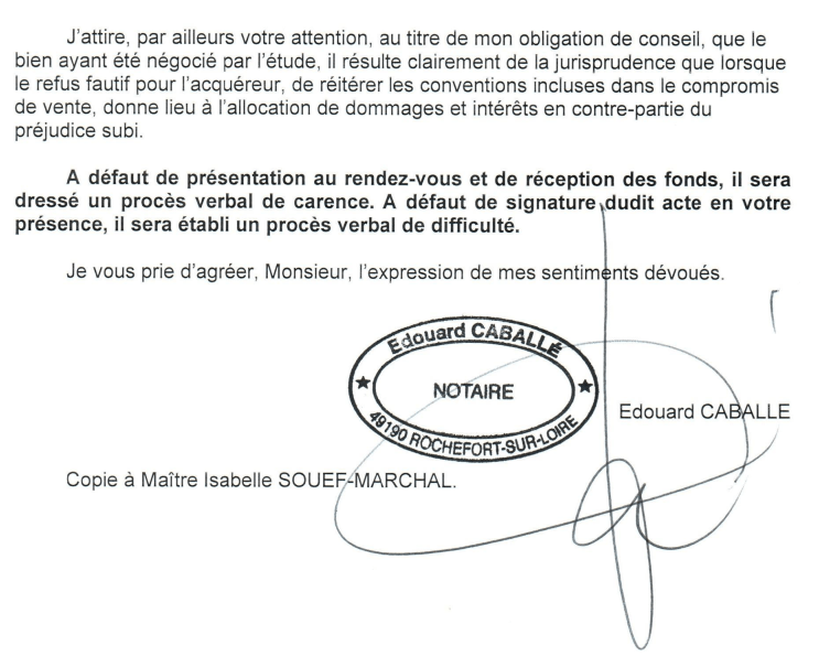 Pour Monsieur CHABERT, non-sachant dans le domaine du droit, le courrier LRAR de mise en demeure émanant d’un officier ministériel, stipulant des clauses pénales pouvant mener à une perte financière de 9.800€ pour l’ACQUÉREUR, est apparu comme un document donnant « force et crédit » à la personne qui l’a rédigé.