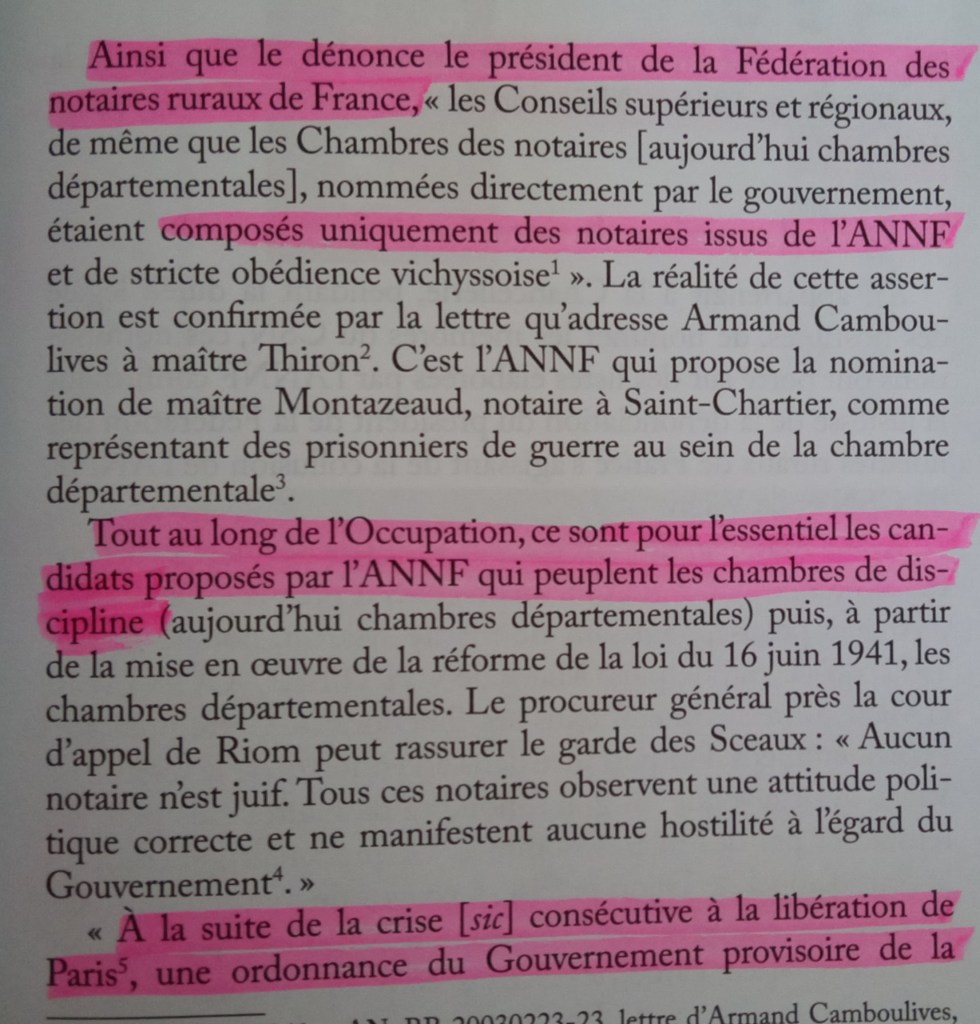 Armand Camboulives, directeur de la direction civile, devait écrire à maître Thiron, président de l’ANNF, pour confirmer, sinon la subordination de la volonté de l’État français aux desiderata de cette association, à tout le moins une identité de vues. Ainsi que le dénonce le président de la Fédération des notaires ruraux de France, « les Conseils supérieurs et régionaux, de même que les Chambres des notaires [aujourd’hui chambres départementales], nommées directement par le gouvernement, étaient composés uniquement des notaires issus de l’ANNF et de stricte obédience vichyssoise ».