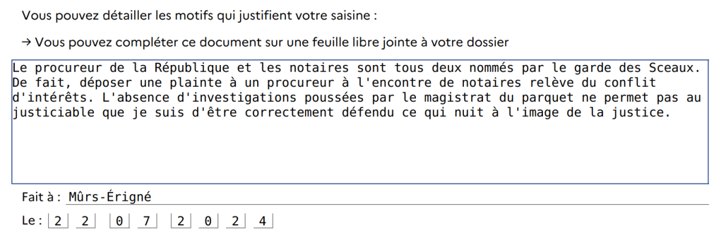 - Qualité du plaignant: La plainte doit être déposée par le justiciable personnellement concerné par la procédure dans laquelle le comportement du magistrat est mis en cause. Il ne peut pas déposer plainte pour une affaire concernant un parent, un ami, un client, un collègue, etc.
