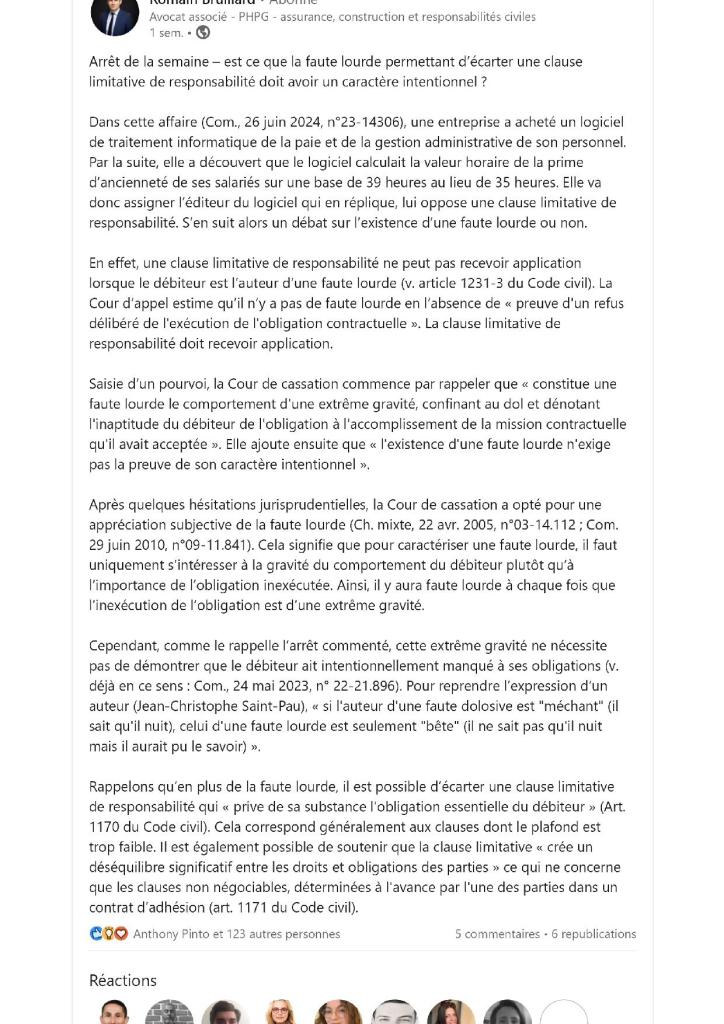 L’avocat parisien Romain BRUILLARD, Avocat associé – PHPG – assurance, construction et responsabilités civiles, nous partage cette jurisprudence de la cour de cassation: est ce que la faute lourde permettant d’écarter une clause limitative de responsabilité doit avoir un caractère intentionnel ? (nouvelle fenêtre)