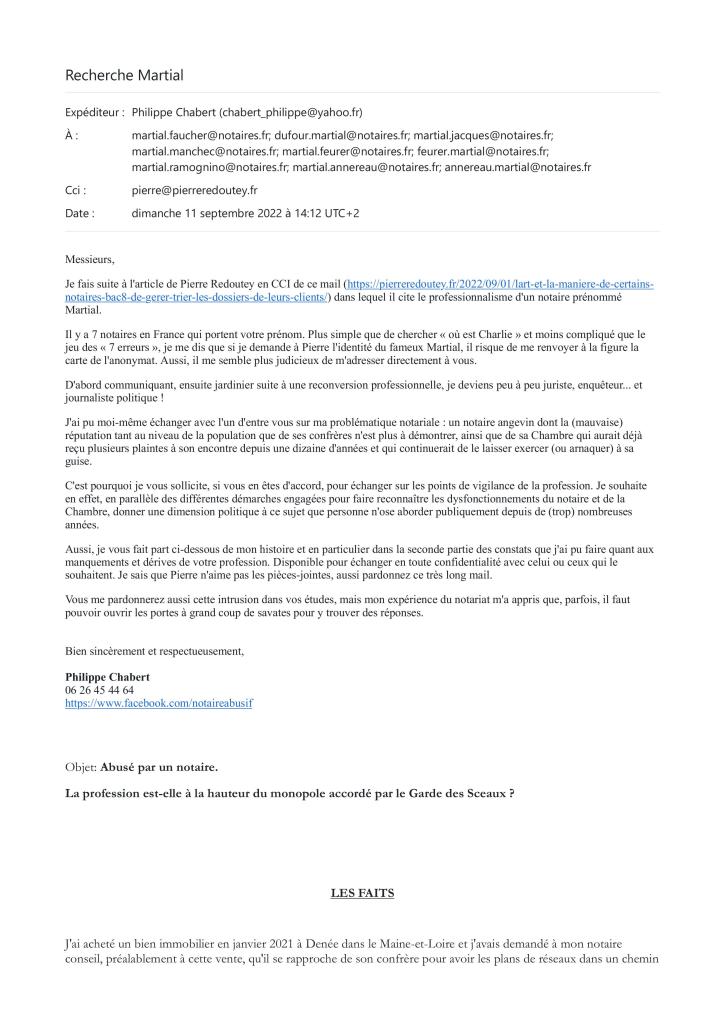 Mon expérience n’est malheureusement pas isolée. Pierre Redoutey, ancien notaire devenu avocat, avait également dénoncé les pratiques de la profession sur son blog CRIDUN avant son décès début 2023 (un clin d’œil au CRIDON, l’organisme officiel de veille juridique pour les notaires). Dans ses écrits de l’époque (le site a été récupéré et les données ont « disparues »), il évoquait notamment les échanges qu’il avait eus avec des notaires dont l’un prénommé « Martial » et qu’il jugeait intègre.